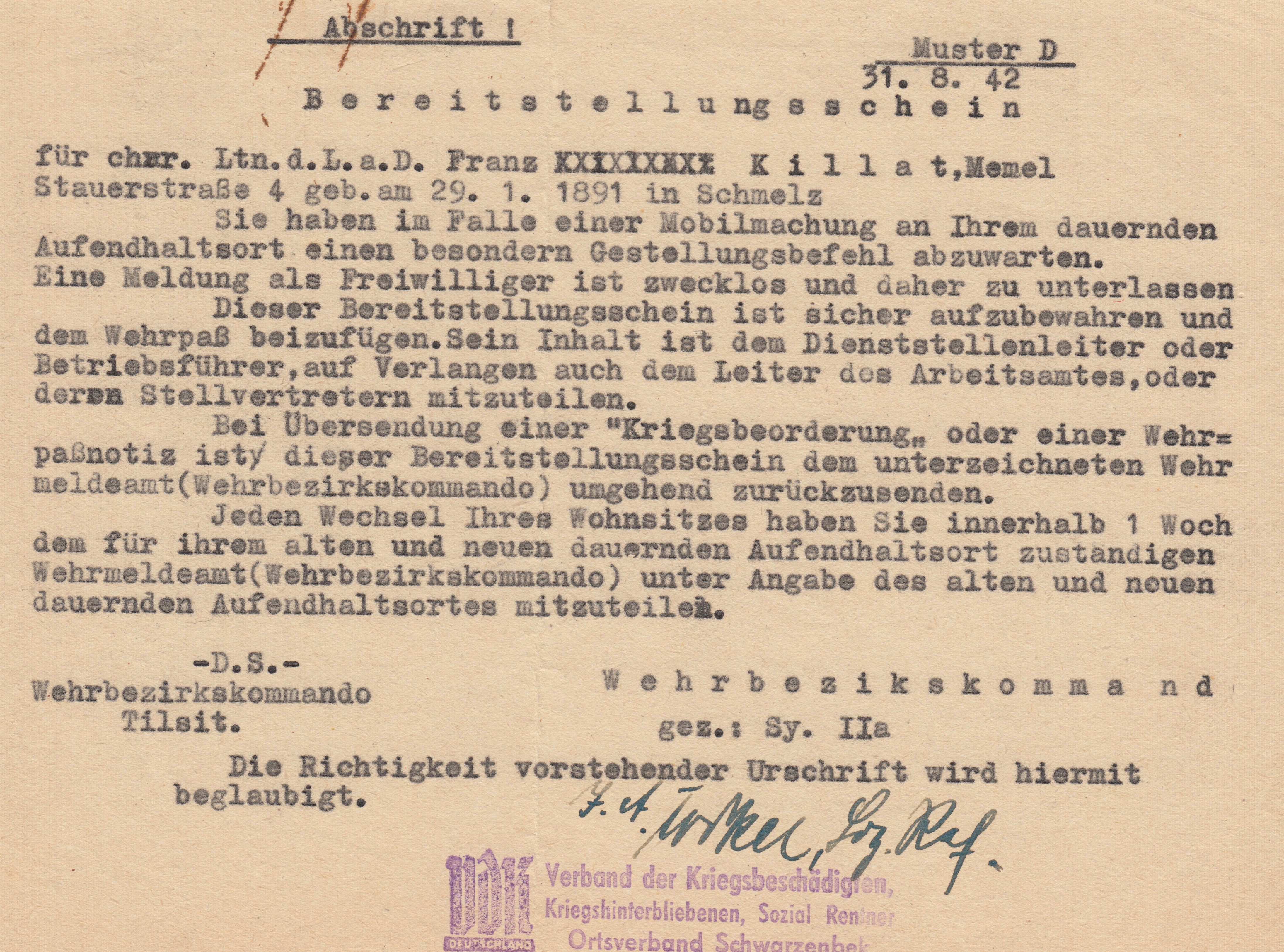- Gestellungsbefehl für Franz Killat vom 31.08.1942. - {Quelle: Archiv Killert, privat} Seite 1