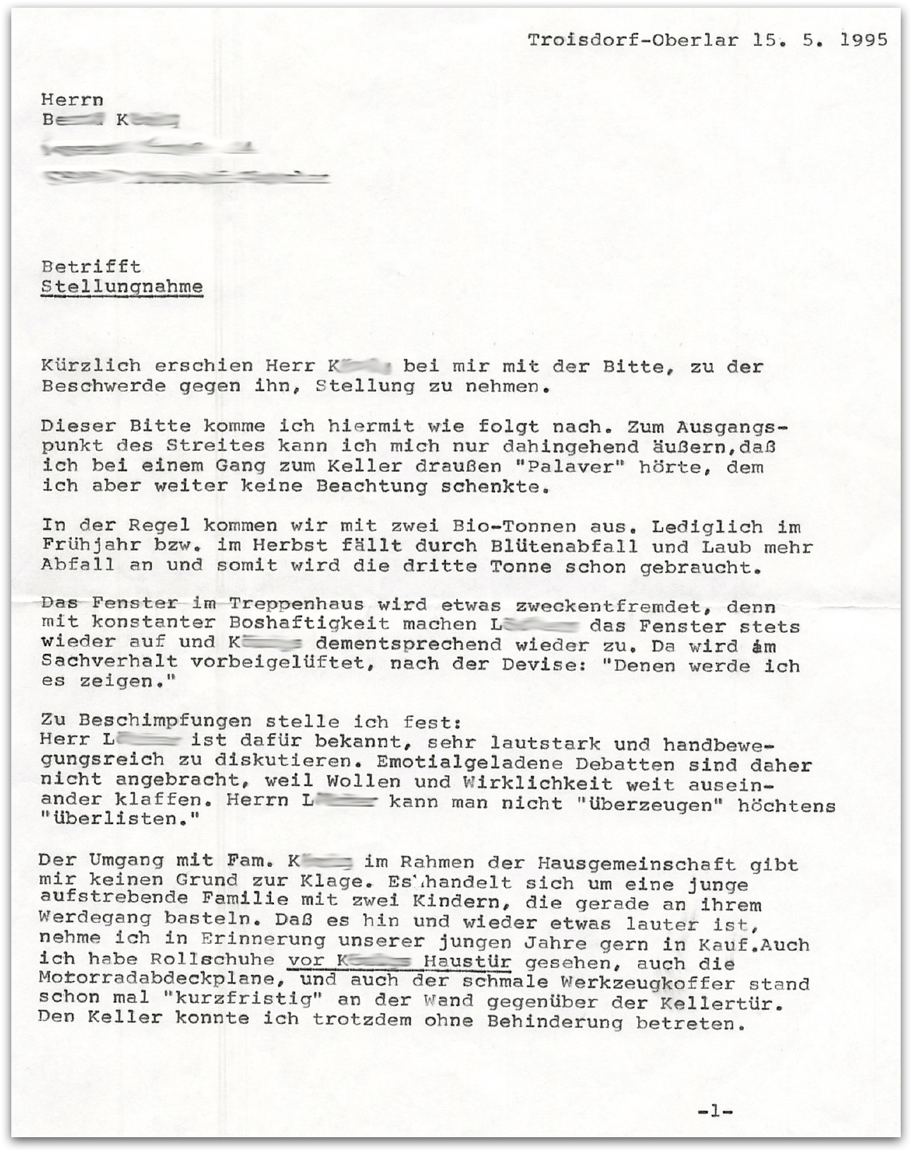 1995 - ich hatte gerade meine erste eigene Wohnung bezogen und habe das nicht mehr ´live´ erlebt - muss diese Hausgemeinschaft, in der meine Eltern fast 50 Jahre verbracht haben, einen Knacks bekommen haben. Eine junge, zugezogene Familie wurde Zielscheibe der Gemeinschaft. Nach diversen Beschwerden (die Schrauben an der Papiertonne, von denen sie gleich lesen werden, kann ich nicht erklären) wollte die Genossenschaft eine Stellungnahme des Beschuldigten (nachfolgend Familie "K") zu den Begebenheiten, maßgeblich vorgetragen durch Familie "L", einem älteren Ehepaar in direkter Nachbarschaft. Zwar leben viele der Protagonisten nicht mehr - ich mache die Namen dennoch unkenntlich.