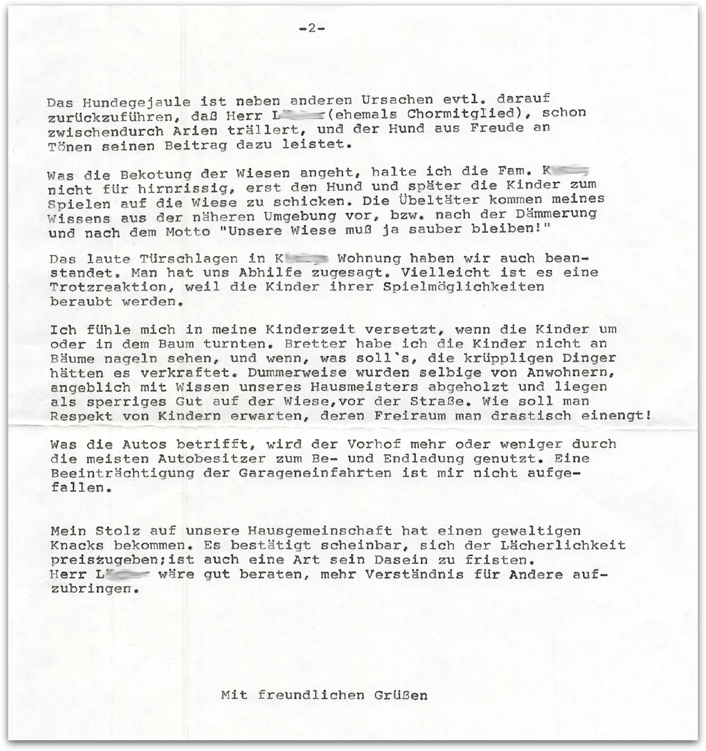 Für mich hat diese Anekdote einen Mehrwert - ich kannte die Menschen, die sich hier in der Wolle hatten. Die lauten Arien von "L" waren tatsächlich durch das ganze Haus zu hören. Und dieser kleinkarierte Scheiß - Fenster auf, Fenster zu - ist so typisch für manche Menschen. Es wirkt aber wie lustiger Weckruf aus längst vergangenen Zeiten.
