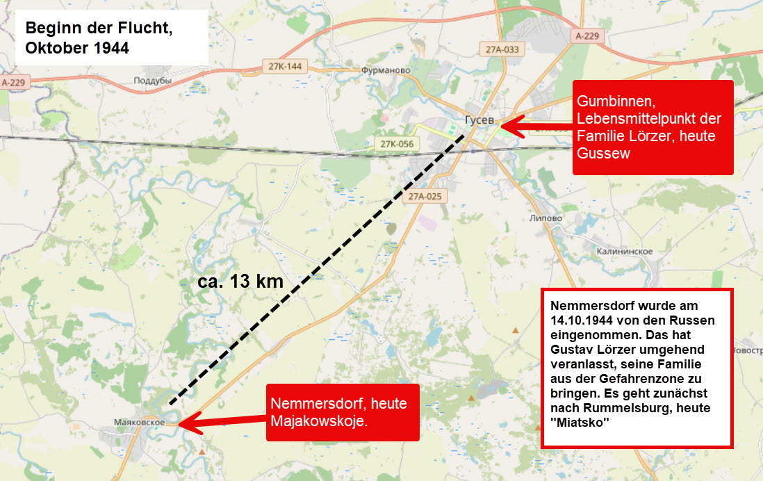 Jedenfalls war es den Menschen klar, dass Familien in Frontnähe nicht sicher waren. Das muss auch meinem Großvater Gustav Lörzer klar gewesen sein. Nemmersdorf war nur wenige Kilometer von der Familie entfernt. Er schickt die Familie wenige Tage nach dieser Auseinandersetzung in Nemmersdorf nach Rummelsburg (heutiger Name "Miatsko") und glaubt seine Familie dort sicher. Aber das ist ein Trugschluss.