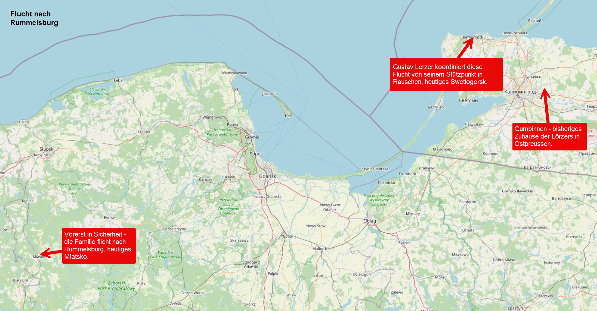 In den folgenden Schilderungen werden viele Ortsnamen erwähnt. Sucht man diese heute bei Google Maps, dann wird man diese nicht finden, denn diese Orte gehören zur Oblast Kaliningrad (ehemals Königsberg) und sind heute russisch. Oder sie gehören heute zu Polen und haben polnische Ortsnamen. Zur Orientierung (und das war die Grundlage für die Erstellung der Fluchtroute) hier eine Übersicht. Die Ortschaften befinden sich heute also zum Teil auf russischem, teilweise auf polnischem Gebiet. Bei der Flucht meines Vaters aus dem Memelland kämen dementsprechend auch noch litauische Ortsnamen hinzu - das wird hier aber nicht weitergehend thematisiert.