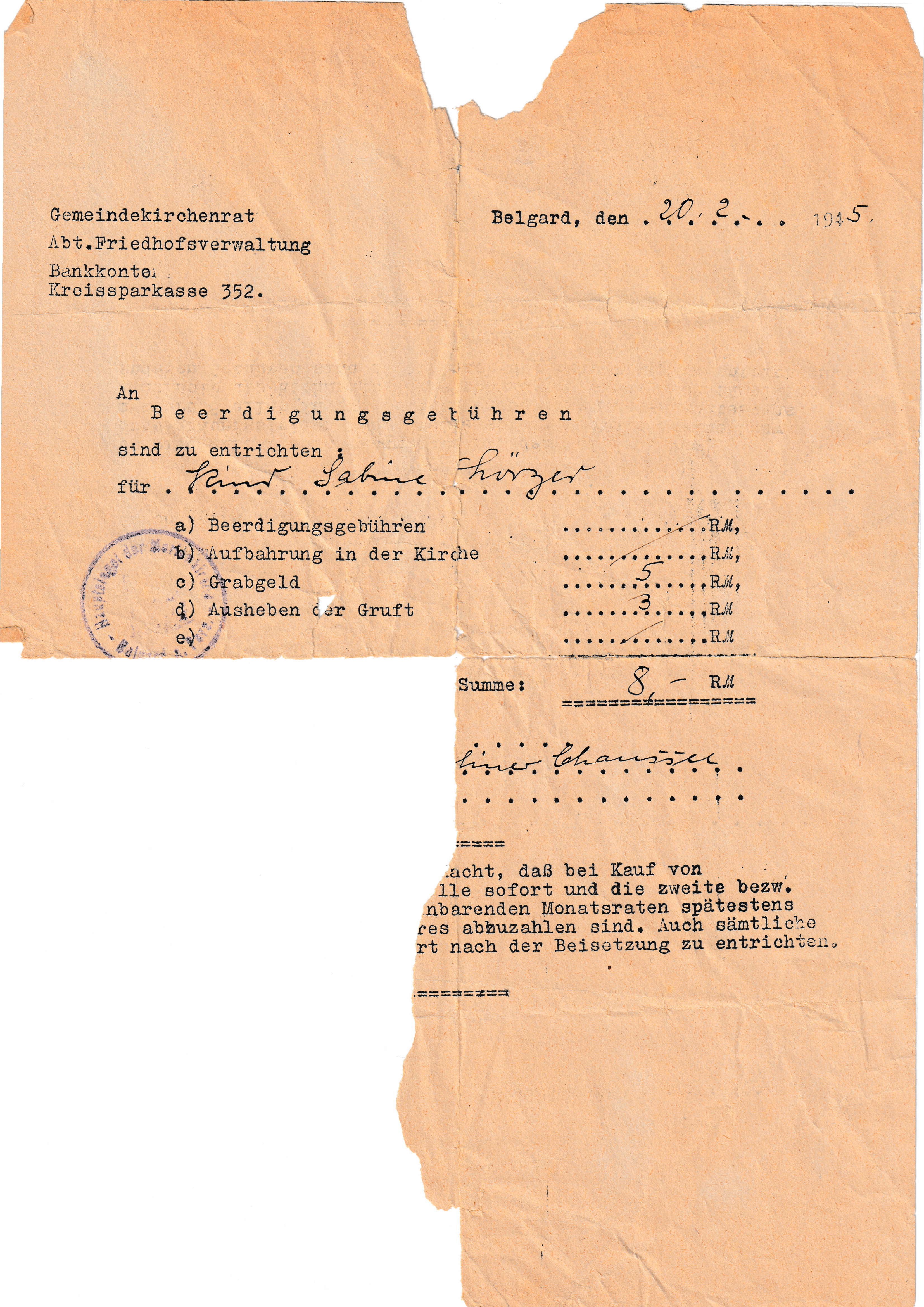 Am nächsten Tag, am späten Vormittag, vielleicht war es auch schon etwa 13^00^ Uhr, machen wir drei Jungen, Joachim, Reinhard und ich uns zum Friedhof auf. Den Weg dahin hat Mutti uns zuvor geschildert. Wir drei müssen wie Kinder von Landstreichern ausgesehen haben, die wir alsbald einem alten Pastor gegenüberstehen, der mit einer Kutsche ankommt, gezogen von einem gutmütigen alten Gaul. So ein Begräbnis hat es bestimmt für ihn noch nicht gegeben. Drei kleine, etwas verwahrlost aussehende Kinder am Grab eines Babys. Joachim erklärt dem Pastor die Umstände, die zu dieser Situation geführt haben. Dieser nahm uns, Reini und mich an die Hand, und wir vier gingen dann zur Leichenhalle, in der der kleine Sarg stand. Zum ersten Mal in unserem Leben werden wir hier mit Leichen konfrontiert. die hier in einer großen Zahl, nur dürftig mit einer Decke, einem Laken zugedeckt, aufgebahrt liegen. Durch den Frost sind sie sicherlich alle gefroren. Sie sind von den durchziehenden Trecks hier nur abgelegt worden, ohne dass sich die Angehörigen die Zeit für ein Begräbnis nehmen. Auf dem Friedhof selbst sind viele frische, große und kleine Hügel zu sehen. Nach uns wird es wohl nur noch ganz wenige richtige Bestattungen auf diesem Friedhof gegeben haben. Zu schnell kommt die Front näher. Ein Totengräber, der im hartgefrorenen Boden sicher große Mühe hatte, ein Loch zu schaufeln, trägt den kleinen Sarg zur Grabstelle, ein Gebet des Pfarrers und alles ist vorüber. - Ich habe mir zu diesem Zeitpunkt keine Gedanken darüber gemacht, warum nur wir drei alleine zum Begräbnis mitgingen, wo doch Tante Anna und die Großeltern auch da waren. Warum das so ist, wird wohl ungeklärt bleiben. Wir sind deswegen ja auch niemandem böse. - Durch einen glücklichen Umstand erhalten wir im Sommer 2001 einen Auszug des Sterberegisters der Stadt Belgard für den Zeitraum 1945/46, der also nicht verloren gegangen ist. In ihm ist auch unsere Schwester Sabine aufgeführt, beerdigt auf dem Belgarder Friedhof Körliner Chaussee. Preußische Gründlichkeit!