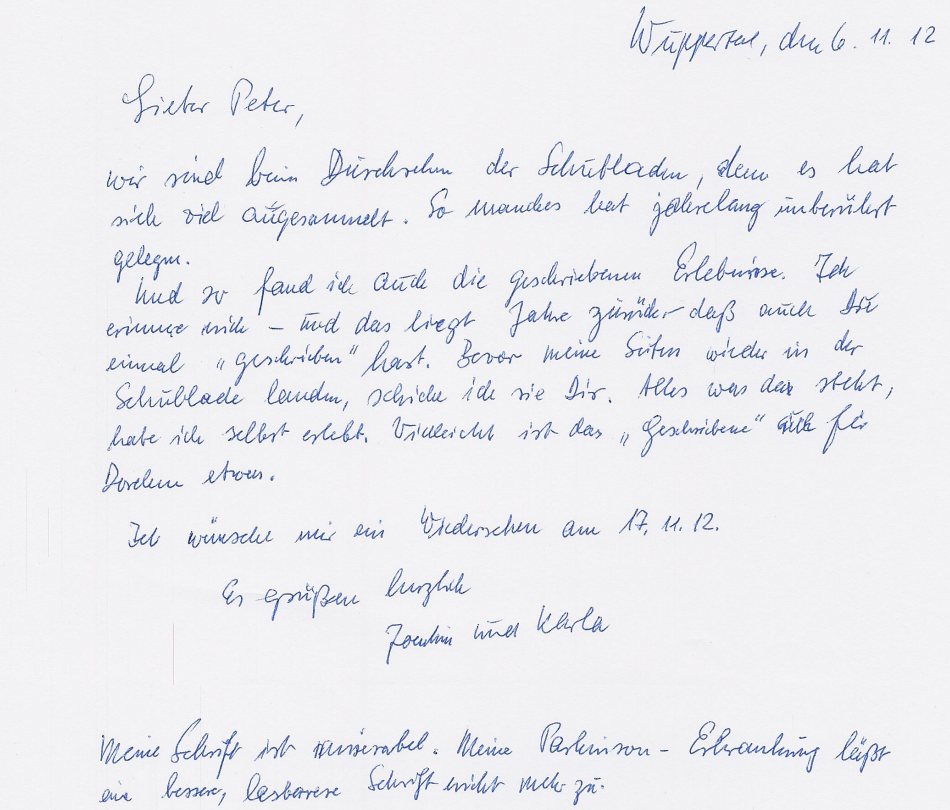Im November 2012 bekam ich Post von meinem Onkel Joachim Lörzer. Der Brief bestand aus einem erklärenden Anschreiben und einigen Seiten mit einigen kurzen vom Onkel verfassten Texten. Er hatte diese in seinen Schubladen gefunden und sie mir einfach geschickt. Er wusste, dass ich literarisch sehr interessiert bin.