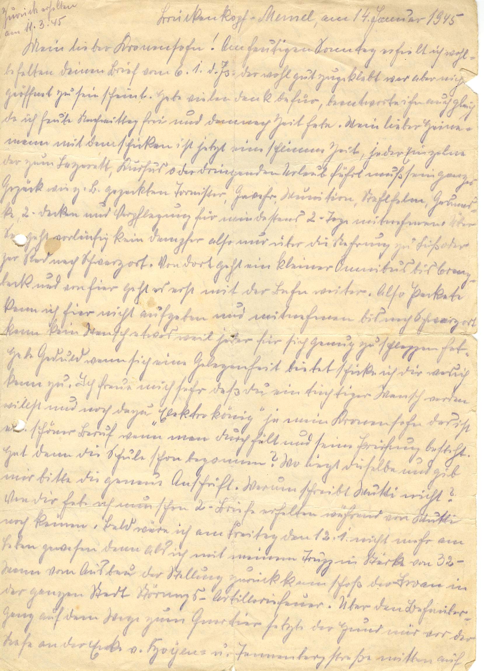 Ja, mein lieber Heinzemann, so geht es hier unverhofft zu, doch hat mich das Schicksal diesmal noch verschont. In den letzten Tagen ist der Ivan böse geworden, weil wir ihn am Mittwoch von der Höhe Miszeiken runter geworfen, so dass er im Sumpf und Pfuhl liegenblieb. Dabei wurden noch ein Major und 43 Mann gefangengenommen. Seit drei Tagen greift der Hund unverhofft ständig an und überschüttet die Stadt mit plötzlichen Feuerüberfällen. Sogar Freitag-Nacht hat er es fertiggebracht, einen Fesselballon auf der Nährung hoch zu lassen. Wir haben versucht denselben abzuschießen, wobei der Beobachter mit dem Fallschirm abspringen musste. Fünf feindliche Ivanflieger wurden am Freitag abgeschossen und stürzten brennend ab. Unsere Stellung hat er nicht befunkt, sondern die Kasernen in der Moltkestrasse, Zentralmolkerei, Jakumeitshaus in der Rippenstrasse, katholische Kirche und noch verschiedene Häuser der Stadt. Seit Freitag greift das Ferkel zu verschiedenen Zeiten an, kommt jedoch nicht durch. Aber es passiert immer etwas. Heute morgen um 10:50 bis 13:40 Uhr und 15:07 Uhr hat er wieder die Stadt anständig bombardiert, aber auch gleichzeitig die Hauptkampflinie in Stärke von zwei Bataillonen und 24 Batterien, das sind 96 Geschütze angegriffen. Ein Erfolg blieb ihm versagt. Darum allem Anschein nach böse, versucht er mit Fliegern, die rückwärtigen Stellungen, in denen die Reserve liegt, mürbe zu machen. Wir waren auch bis 17 Uhr alarmiert und hatten unsere Verteidigungsstellung bezogen. Daher habe ich die ganzen Luftangriffe über der Stadt beobachten können. Einige Flieger wurden heruntergeholt, aber bei der enormen Abwehr war nicht deutlich zu erkennen, wieviele. Jetzt fängt es an im Brückenkopf Memel ungemütlich zu werden. Wie ich heute erfahren habe, wurden ein Feldwebel, ein Unteroffizier und zwei Mann auf unserem Hofe getroffen. Der Feldwebel verlor beide Beine hatte noch die Kraft sich seine Pistole zu greifen und hat sich erschossen um sich nicht lange quälen zu brauchen. Ist das nicht ein Held? So weit ist noch alles in Ordnung, wollte nach unserer Hütte gehen, ob sie noch steht, wurde aber durch den Angriff daran gehindert. Vielleicht komme ich in der nächsten Woche dazu. Bin noch gesund und munter, grüsse die Mutti und alle Bekannten recht herzlich. Memel wird mit jedem Tage ein grösserer Schutthaufen. Dir sende ich herzliche Grüsse mein Sohn bis auf ein Wiedersehen in alter Frische.