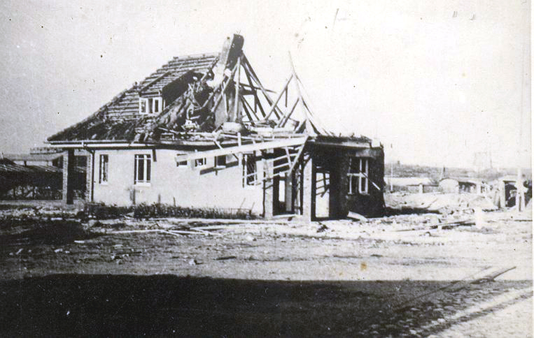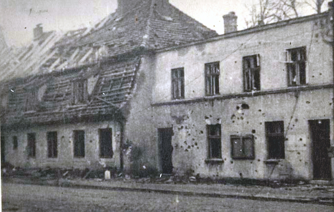 Bald wäre ich am Freitag den 12.01. nicht mehr am Leben gewesen. Denn als ich mit meinem Trupp in Stärke von 32 Mann vom Ausbau der Stellung zurückkam, schoss der Ivan in der ganzen Stadt Störungsartelleriefeuer. Über dem Bahnübergang auf dem Wege zum Quartier setzte der Hund mir vor der Straße an der Ecke von Boyen und Tannenbergstrasse mitten auf der Chaussee einen ganz netten Brocken unverhofft hin. Ich flog von dem Luftdruck gegen die Mauer des roten Schuppen am Stellwerk. Während zwei Kameraden fünf Schritte vor mir verwundet liegen blieben. Nach kurzer Zeit erhob ich mich, ging zu den Kameraden, legte den Schwerblutenden einen Notverband an und brachte ihn mit Hilfe von Infanterie in den Keller des nächsten Hauses. Dann hielt ich einen Kradmelder an, der unseren Sanitäter holte und bestellte den Krankenwagen. Der zweite Kamerad hatte nur eine leichte Verwundung durch einen Splitter im rechten Unterarm. Der erste Kamerad Messedat wurde durch drei Splitter durch den Stahlhelm am Kopf, Brust und rechten Unterschenkel schwer verwundet. Wurde dann nach kurzer Zeit nach dem Feldlazarett geschafft, gleich operiert und hat bis Sonnabend um 5:40 nur noch gelebt. Gleichzeitig wurde durch denselben Treffer ein herrenloses Pferd tödlich getroffen. Mein ganzer Trupp war in den Keller gelaufen und man schon gemeldet, dass ich auch schwer verwundet bin. Wie freute sich mein führer, dass ich nach einer Stunde gesund und fidel im Quartier ankam und Bericht erstattete.