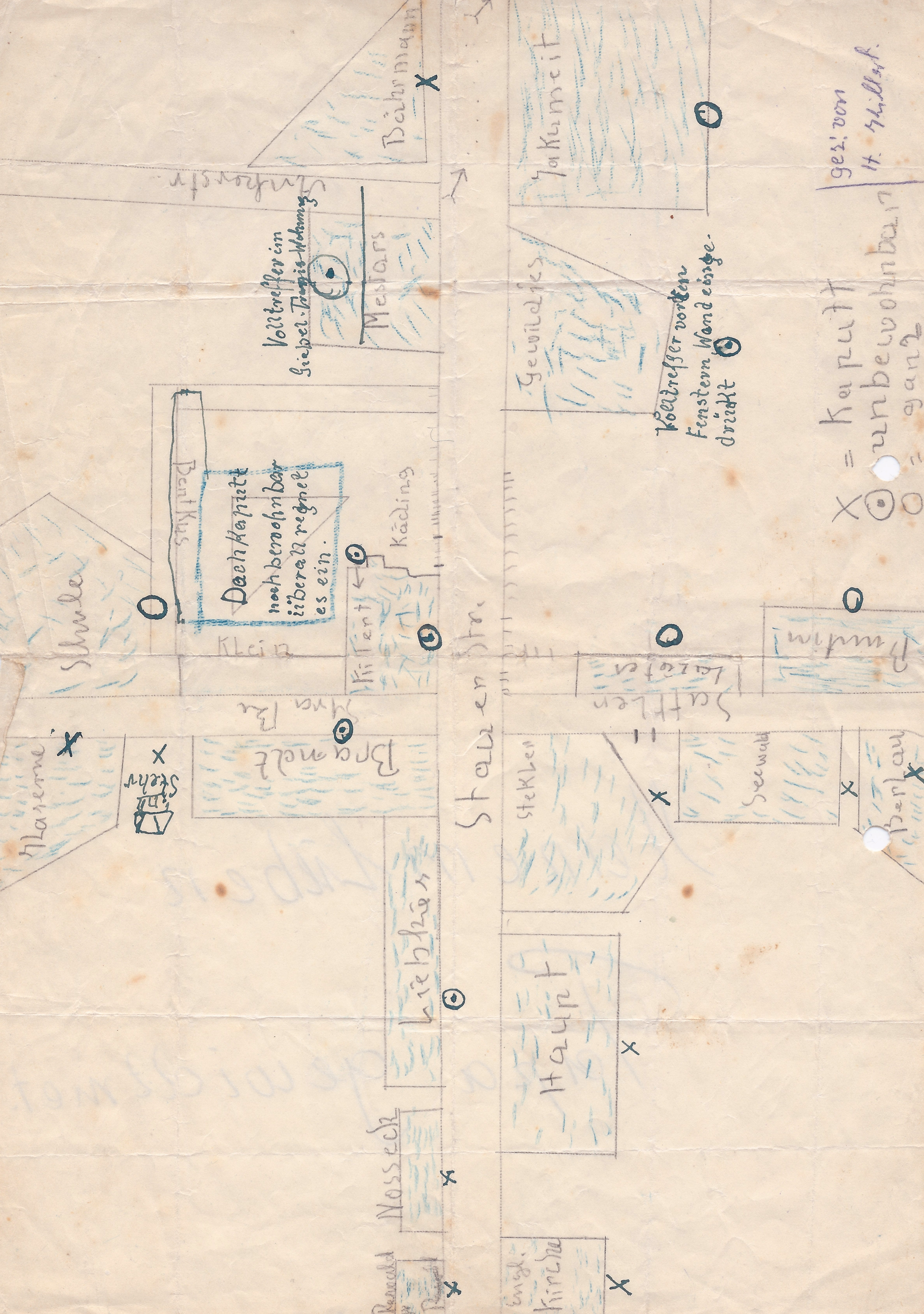 Als ich den Nachlass meines Vaters durchgesehen habe da fand ich auch eine Zeichnung, die mein Vater als vermutlich 13jähriger für seinen Vater angefertigt hatte. Darin dokumentiert mein Vater die Beschädigungen in Memel durch die russischen Angriffe. Auf der Rückseite der Zeichnung steht: "Meinem lieben Papa gewidmet."