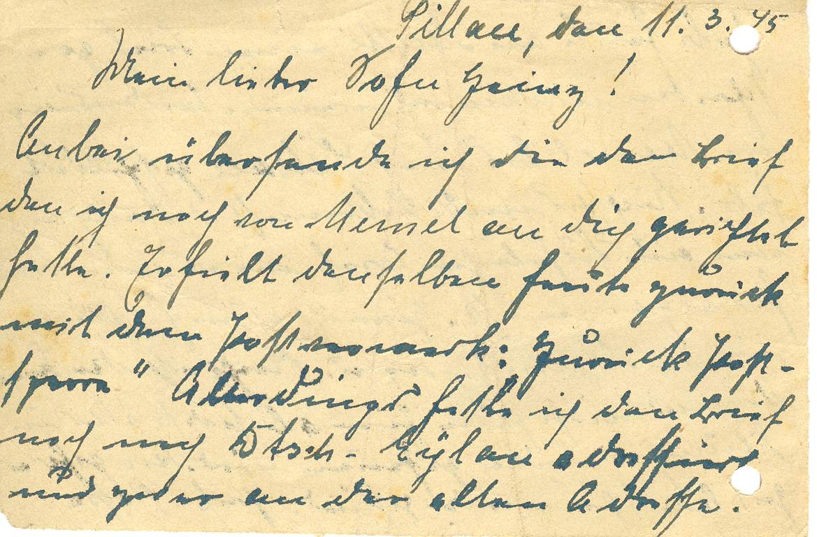 Habe heute an Mutti einen Brief geschrieben in dem ich meinen ... |Unleserlich - vermutlich kurze Beschreibung der Umstände| ... bis nach Pillau geschildert habe. Nächstesmal bekommst die auch einen ausführlichen Brief wie es mir bisher ergangen ist.