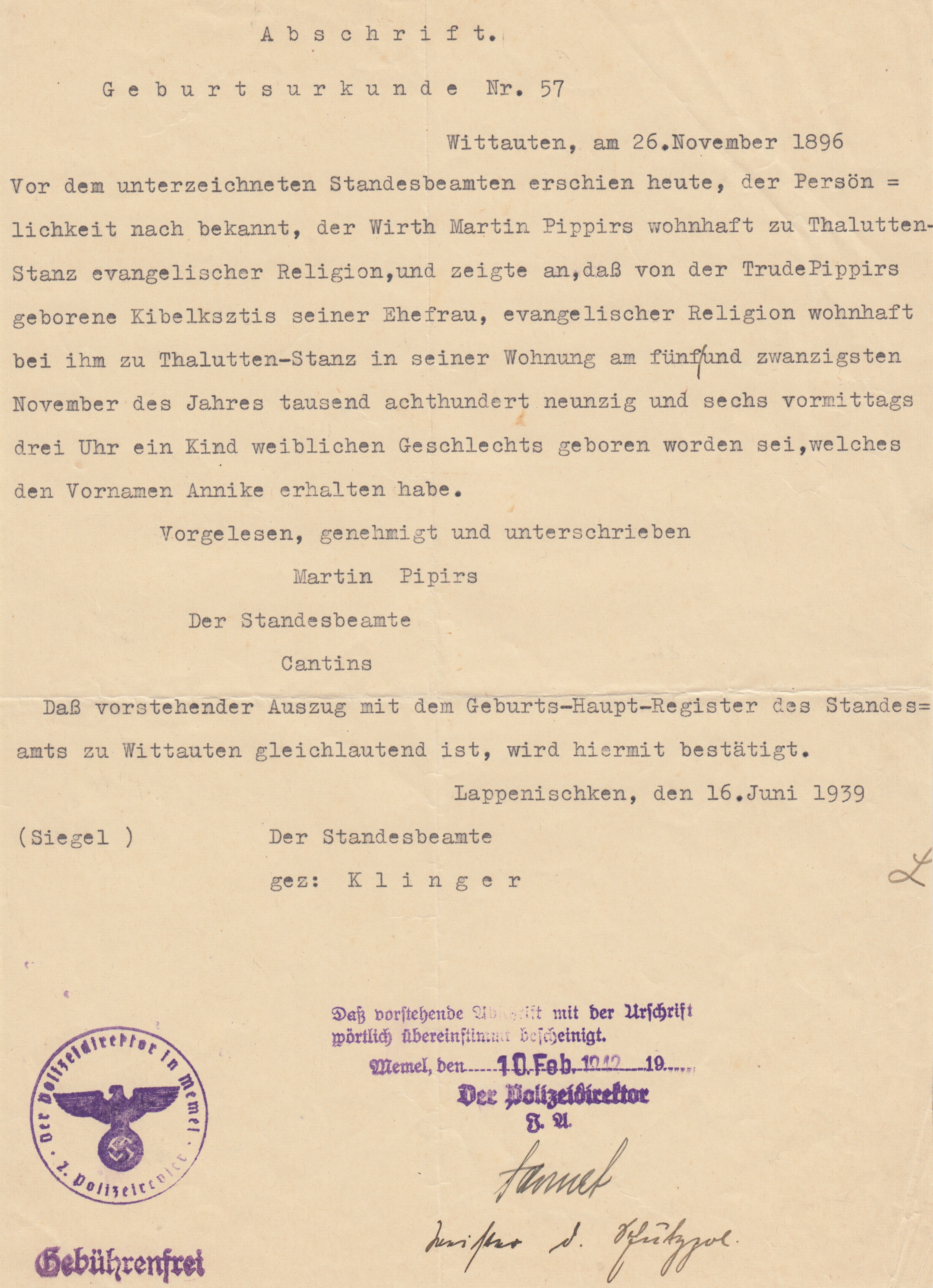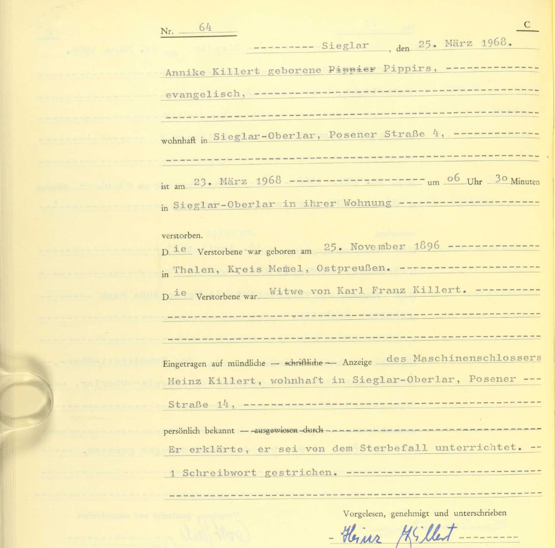 Das Stadtarchiv in Troisdorf arbeitet mit Ancestry zusammen. So habe ich den Eintrag der Sterbeurkunde von Annike Killert finden können - unterschrieben von meinem Vater: