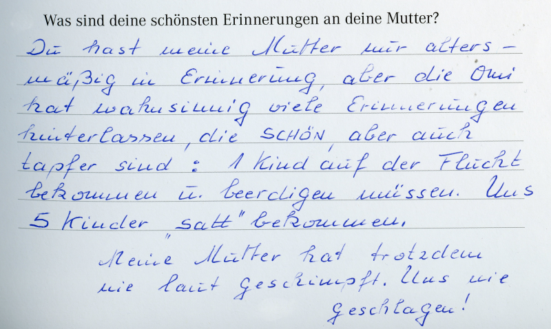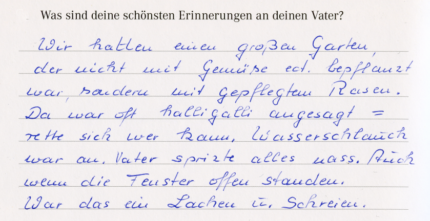 Meine Mutter hat auch im hohen Alter ständig von ihrem Vater gesprochen. Wie er sich gefreut hat, nach drei Jungs jetzt auch eine Tochter zu haben. Dass er seinen Kindern das Schachspielen beigebracht hat und sich immer auf seine Kinder gefreut hat, wenn er mal zu Hause gewesen ist. Auch als meine Mutter schon pflegebedürftig im Bett lag, waren die Erinnerungen an die Kindheit und vor allem an den Vater ständig präsent und wurden immer wieder erwähnt. Als ich einmal erwähnt habe, dass sich ihre Eltern Briefe geschrieben haben, sagte sie sofort den Kosenamen "Puttichen". In zwei von meiner Mutter ausgefüllten Erinnerungsbüchern macht sie zu ihren Eltern diese Einträge: