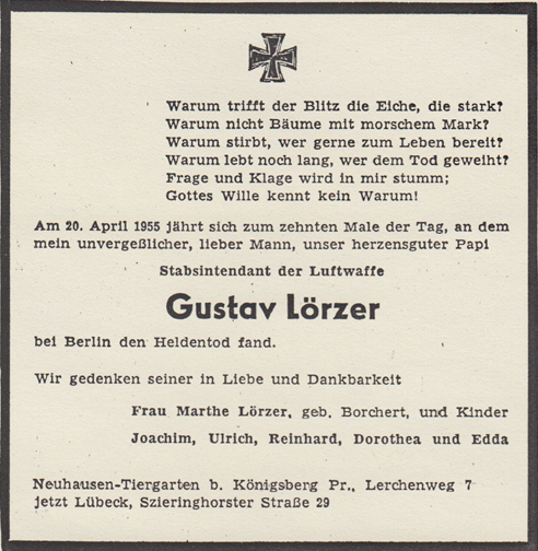 In den Unterlagen bei der Wohnungsauflösung meiner Eltern habe ich auch eine kleine Gedenkkarte zu Gustav Lörzer. Darin abgedruckt eine Anzeige aus dem Jahr 1955.