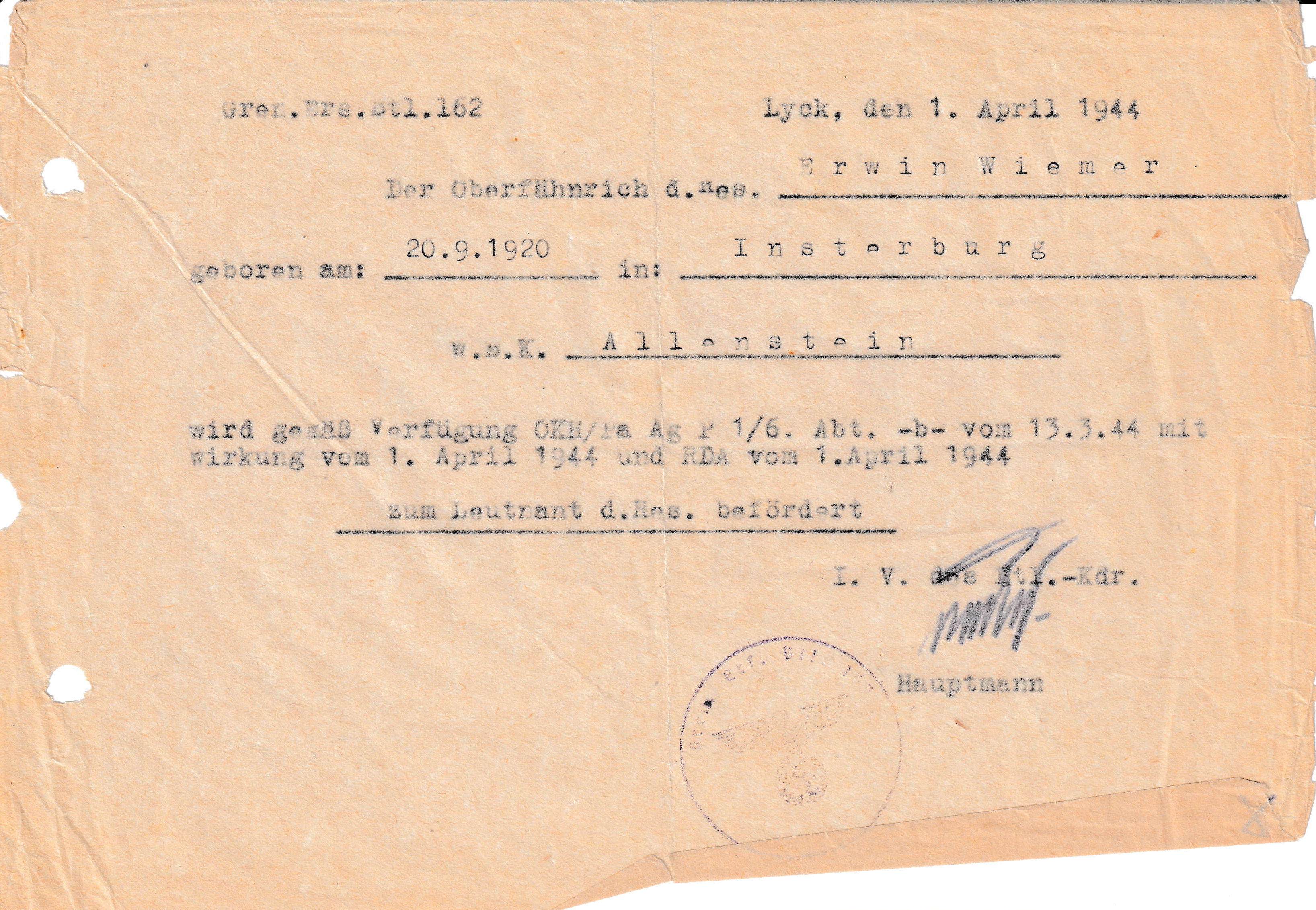 Erwin Wiemer Geburtsurkunde |
