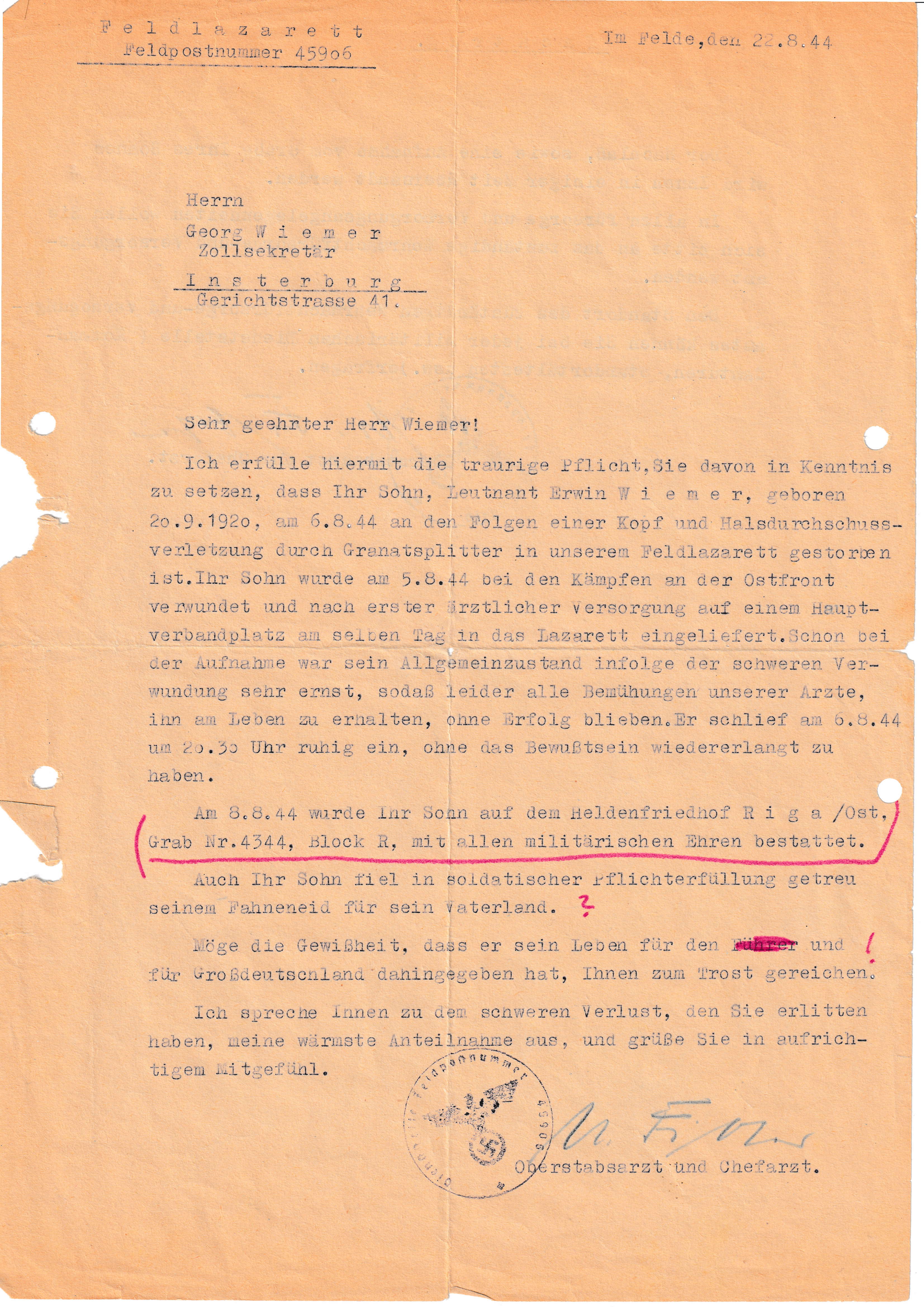 Ich finde eines sehr bemerkenswert: auf der ersten Seite der Todesmitteilung wird das Wort "Führer" durchgestrichen. Ich weiß leider nicht, wer diese farblichen Anmerkungen gemacht hat. Vielleicht sollte das nur hervorgehoben werden, wenn da nicht noch das Fragezeichen hinter dem Wort "Fahneneid" gesetzt wäre. Nach einem Satz, der Eltern wie eine Verhöhnung vorkommen muss.