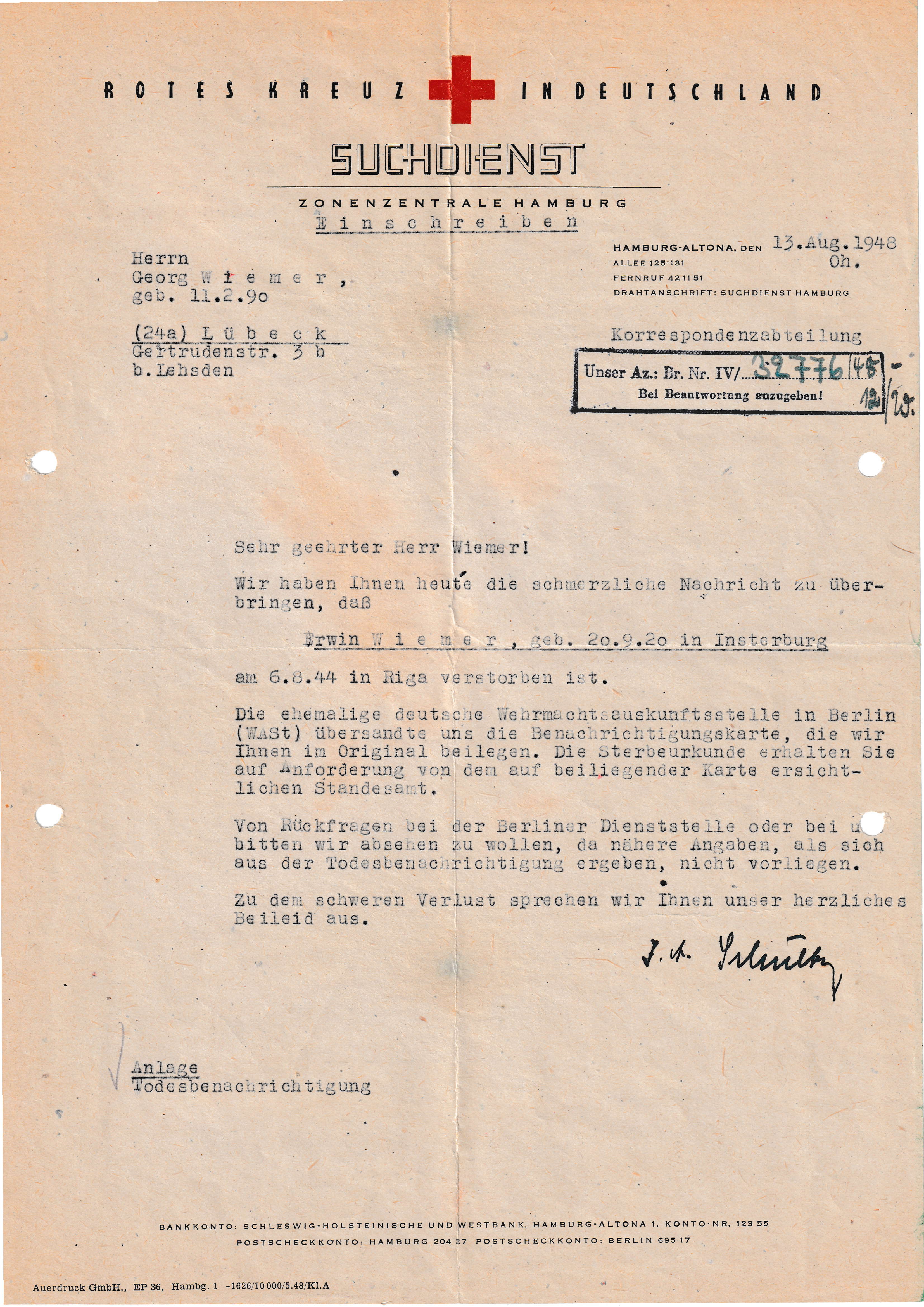 Seit ich mich mit dieser Ahnendokumentation beschäftige war mir klar, dass eine Dokumentation des Schicksals dieser beiden jungen Menschen ganz besonders sein würde. Vor allen Dingen aber auch das Leid und die quälende Ungewissheit, die die Eltern der beiden haben durchleiden müssen. Meta Wiemer (1900-1989), geb. Lörzer hat darüber hinaus nicht nur beide Söhne, sondern auch vier Brüder verloren, die Heimat und auch der Ehemann starb wenige Jahre nach Krieg.