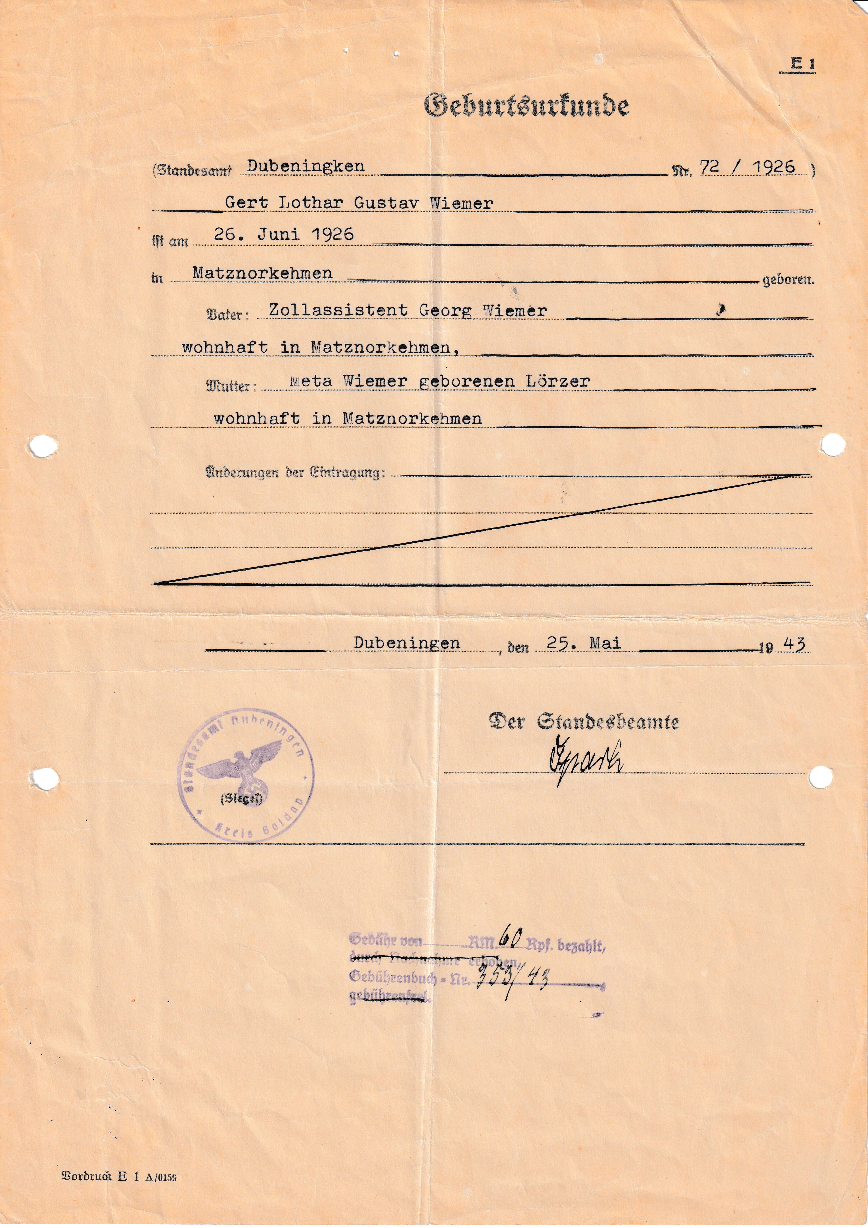 Lothar Wiemer Geburtsurkunde |