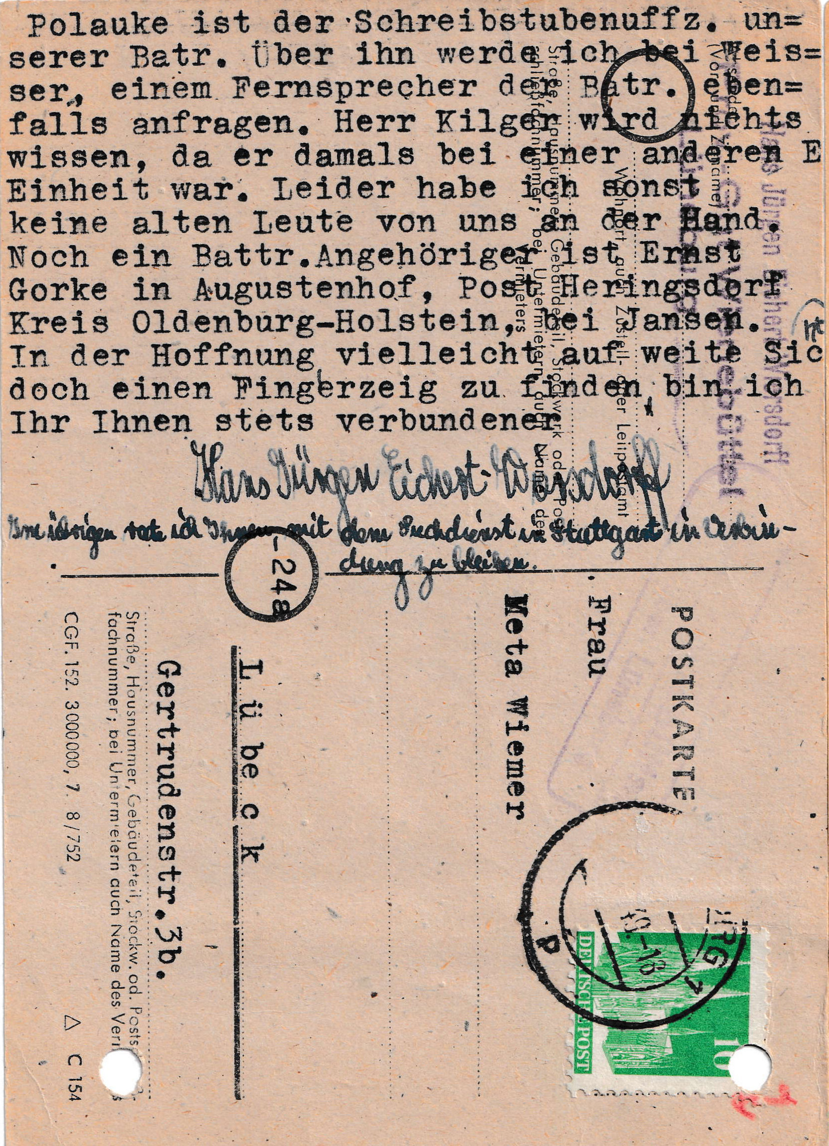 Die Wiemers haben aber nichts unversucht gelassen, über verschiedene Kontaktmöglichkeiten, insbesondere Kameraden von Lothar Wiemer, die den Krieg überlebt haben, an Informationen zu kommen. Einige davon stelle ich hier ohne Kommentierung rein - es gibt hier leider kein Happy End.