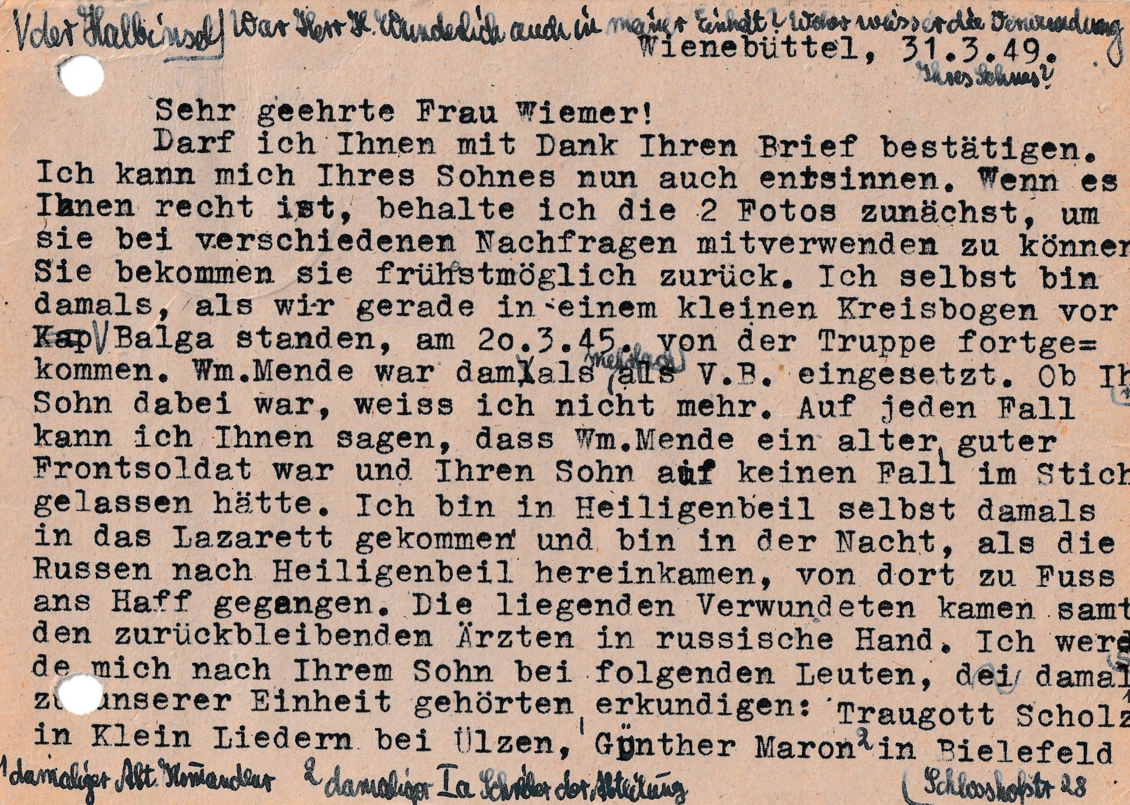 Wie schlimm muss es dann gewesen sein, als man irgendwann von dem jüngeren Sohn Lothar nichts mehr gehört hat. Wenn zu der tiefen Trauer, zur Vorstellung des Leids eines solch schlimmen Todes jetzt noch die Ungewissheit dazu kommt. Und die Ungewissheit hält an und an. Und sie wird auch durch diese vielen Schreiben von Kameraden leider nicht aufgelöst wird. Fakt ist, dass das Schicksal von Lothar Wiemer nicht vollständig geklört ist. Bei "Ancestry" ist ein Tod bei Heiligenbeil in Ostpreußen in der Endphase der russischen Offensive am wahrscheinlichsten ist.