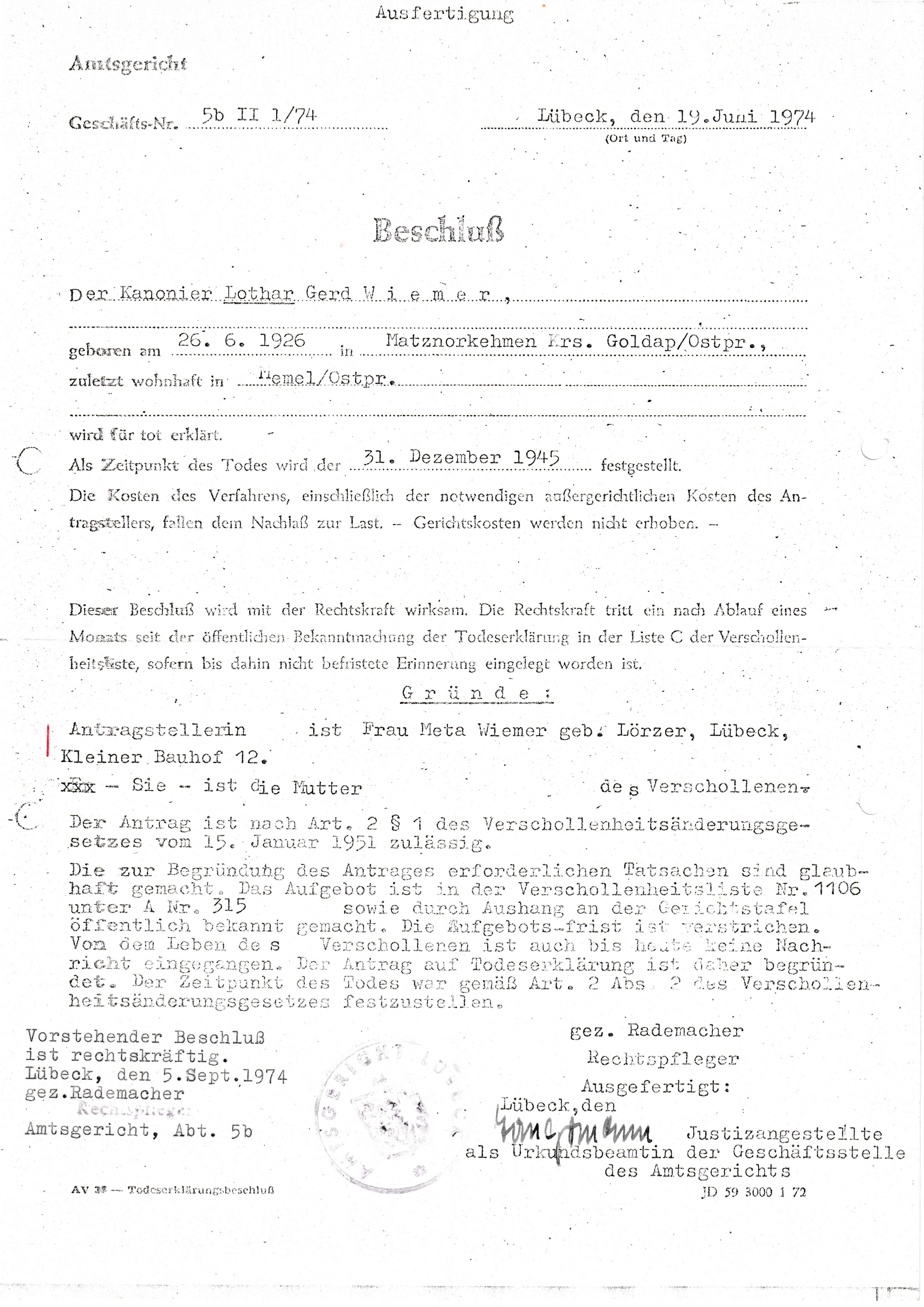 Ein endgültiges Ende findet die Unbestimmtheit formal im Juni 1974, als Lothar Wiemer für tot erklärt wird. Kleine Anmerkung: Das Datum, an dem dies rechtskräftig wird ist ausgerechnet mein Geburtstag :-)