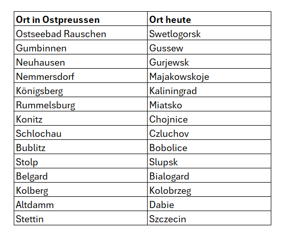 In den folgenden Schilderungen werden viele Ortsnamen erwähnt. Sucht man diese heute bei Google Maps, dann wird man diese nicht finden, denn diese Orte gehören zur Oblast Kaliningrad (ehemals Königsberg) und sind heute russisch. Oder sie gehören heute zu Polen und haben polnische Ortsnamen. Zur Orientierung (und das war die Grundlage für die Erstellung der Fluchtroute) hier eine Übersicht. Die Ortschaften befinden sich heute also zum Teil auf russischem, teilweise auf polnischem Gebiet. Bei der Flucht meines Vaters aus dem Memelland kämen dementsprechend auch noch litauische Ortsnamen hinzu - das wird hier aber nicht weitergehend thematisiert.
