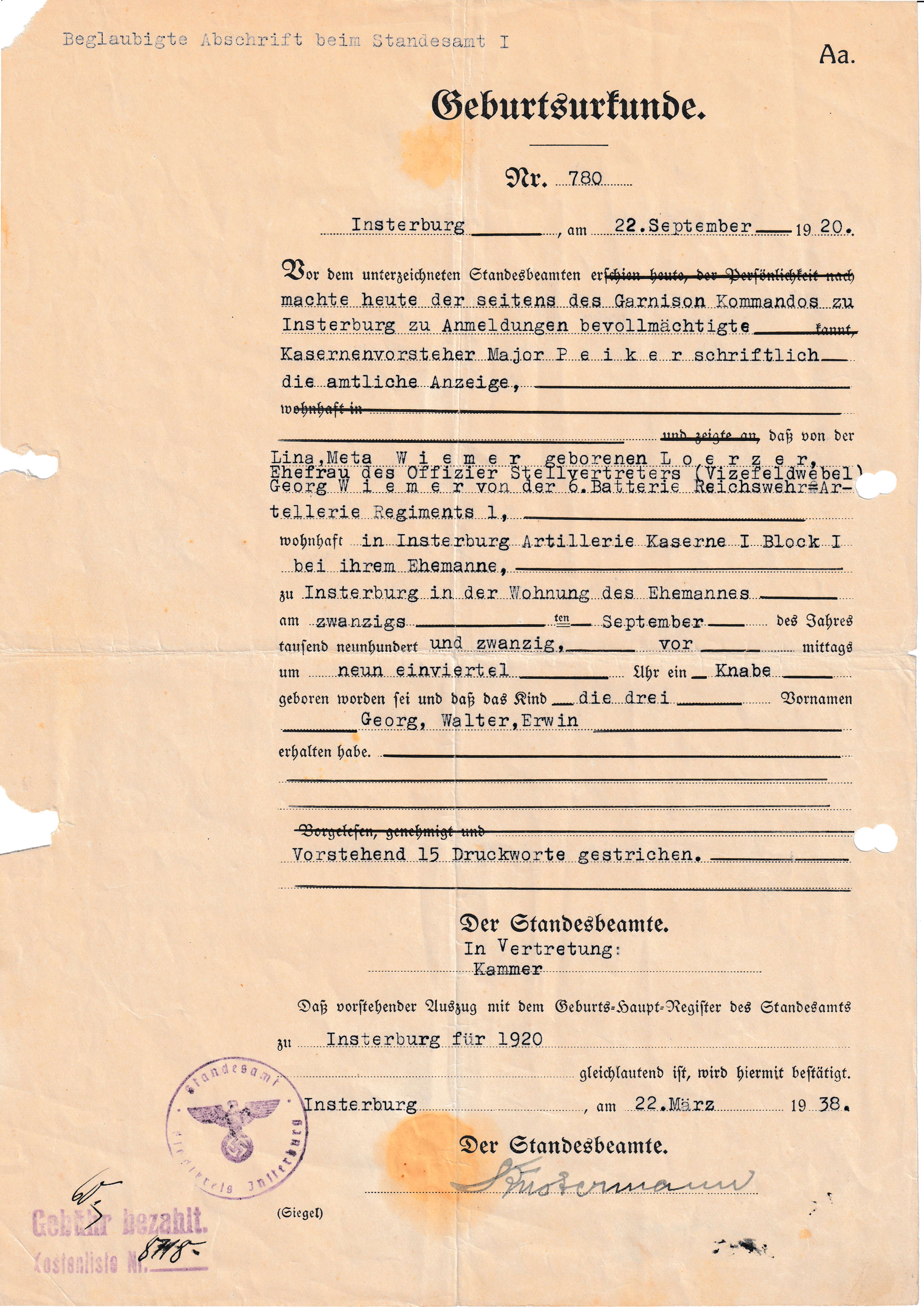 Erwin (1920-1944) und Lothar Wiemer (1926-1945) waren die Söhne von meiner Großtante Meta Wiemer (1900-1989) geb. Lörzer und Georg Wiemer (1890-1950). Ihr Schicksal steht hier stellvertretend für so viele tausende junger deutscher Soldaten, die während des 2. Weltkrieges einen sinnlosen Tod starben. Die Erläuterungen und Dokumente auf dieser Seite mögen eine Mahnung dafür sein, dass so eine Zeit nicht wiederkommen darf. Erwin Wiemer starb im August 1944 bei Riga. Lothar Wiemer galt als verschollen. Trauer und lähmende, quälende Ungewissheit gehörten zu einem Alltag, den wir uns heute gar nicht mehr vorstellen können.